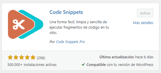 El primer paso es instalar el plugin desde la administración de nuestro WordPress -> Plugins -> Añadir Nuevo – > Buscamos por «Code Snippets» e instalamos este: