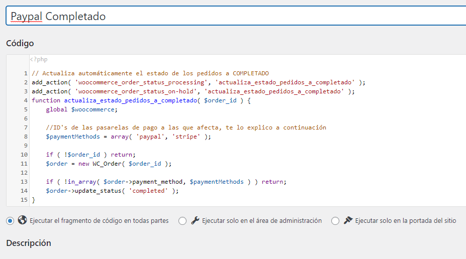 Al guardar este codigo ya tendríamos habilitada la función. Ojo: El código está listo para que aplique para Paypal y Stripe. Si necesitamos cubrir alguna otra pasarela debemos especificarlo en la linea donde se especifican las pasarelas. La cual es esta: